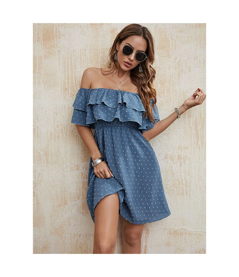 Solid Color Puff Sleeve Ruffles Off Shoulder Tied Rope Vacation Dress Wholesale Dresses SD203764
