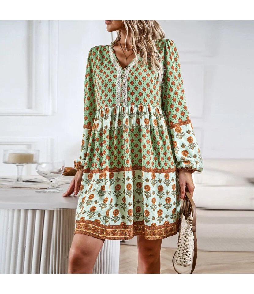 V-Neck Fashion Printed Ruffled 3/4 Sleeve Casual Dress Wholesale Dresses Chiffon Dress Chic SD204218