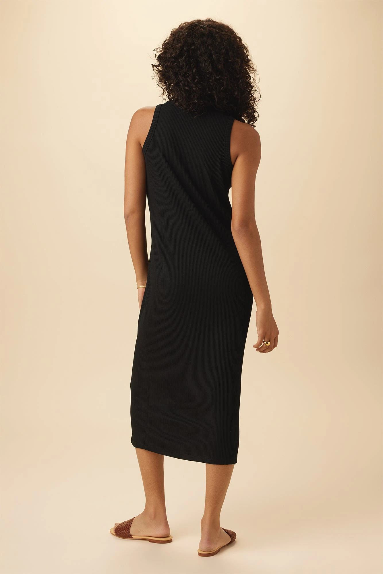 - Sleeveless racerback midi dress featuring thick strap bands, high crewneck and midi length.