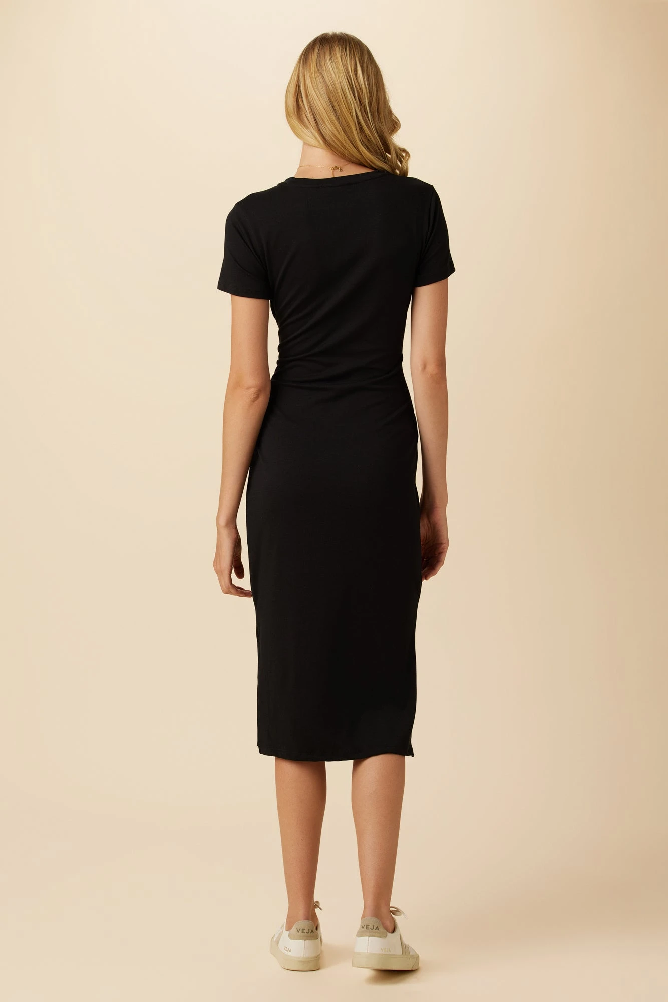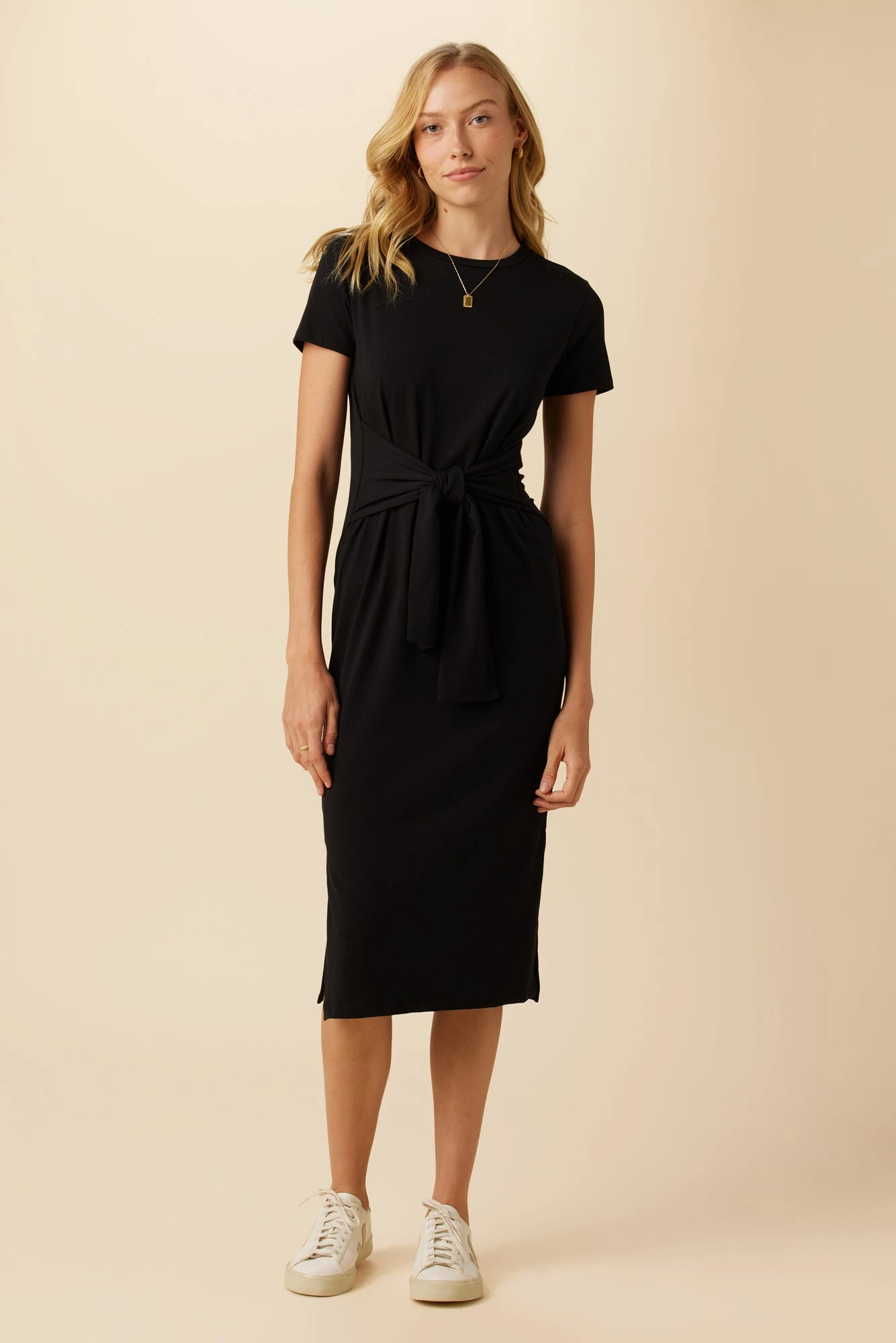 - Short sleeve midi length dress that is as comfortable as it is flattering.