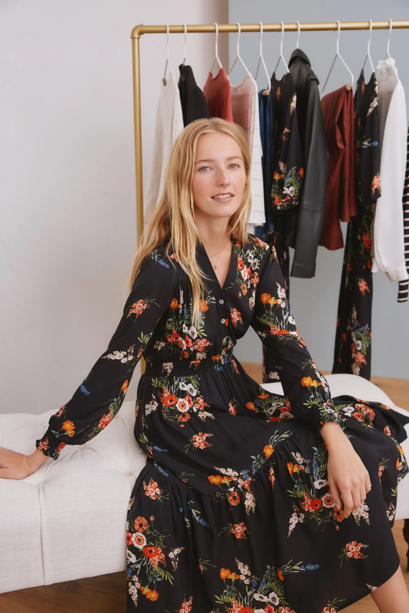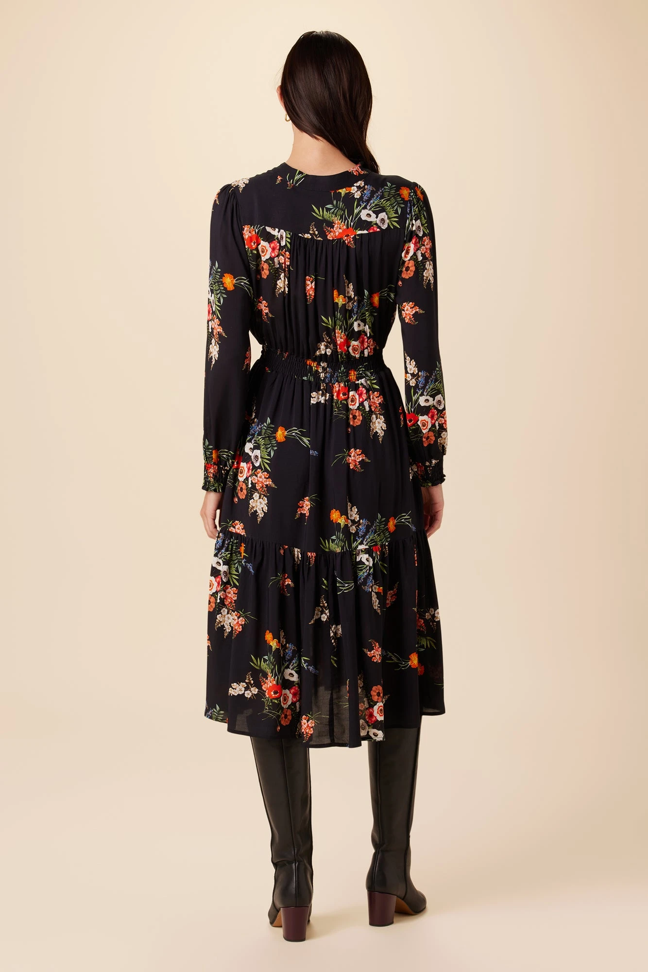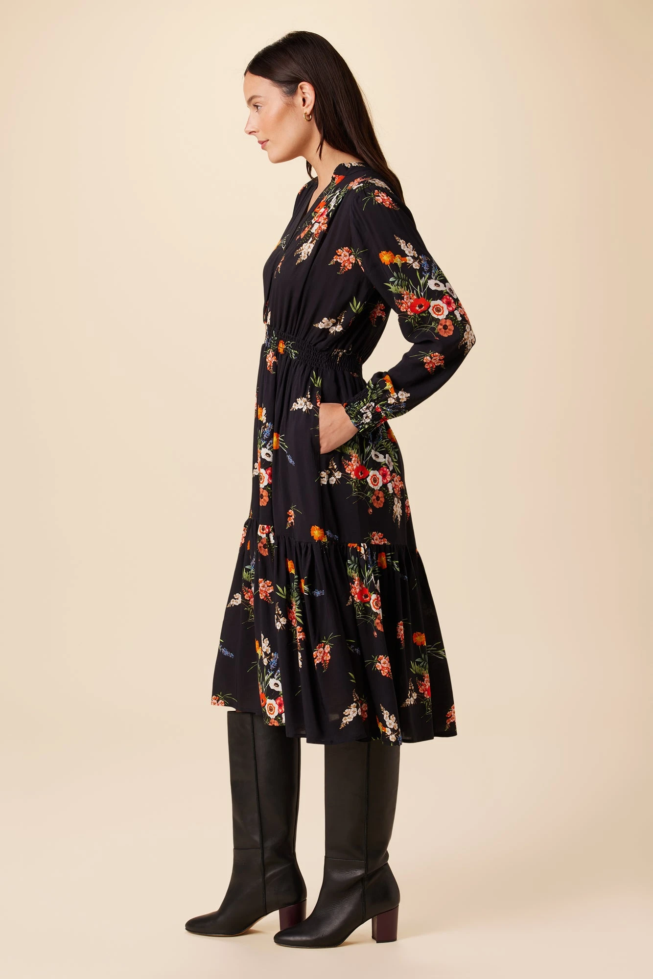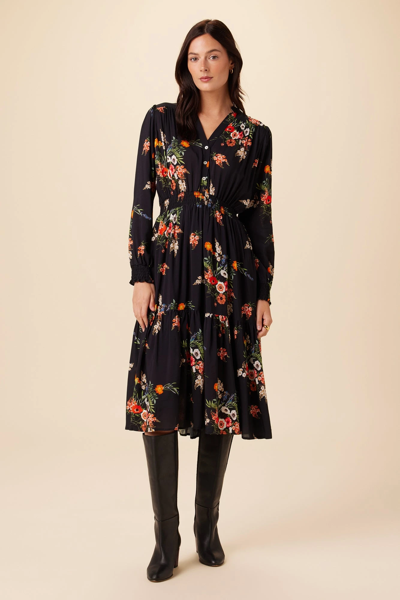 A long sleeve shirt dress, smocked waist and cuff detail with flounce skirt and an a-line button detail on front placket down to waist, made in our sustainable ECOVEROâ„¢ Viscose fabric.