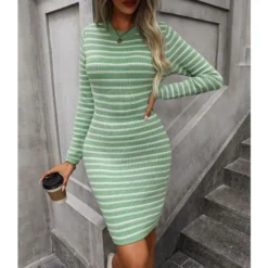 Stylish Inter-Colour Striped Round Neck Mid-Length Knitted Dress Wholesale Dresses N5923082600024
