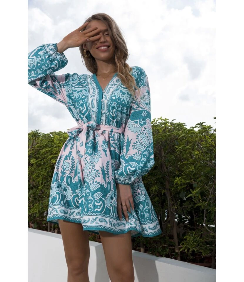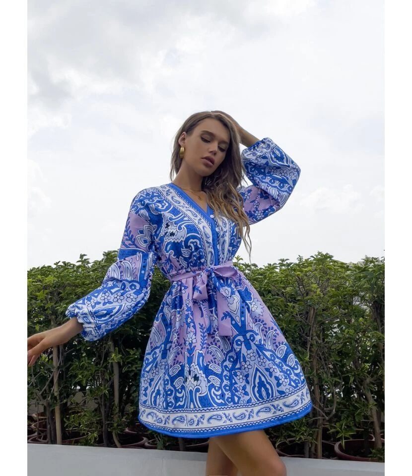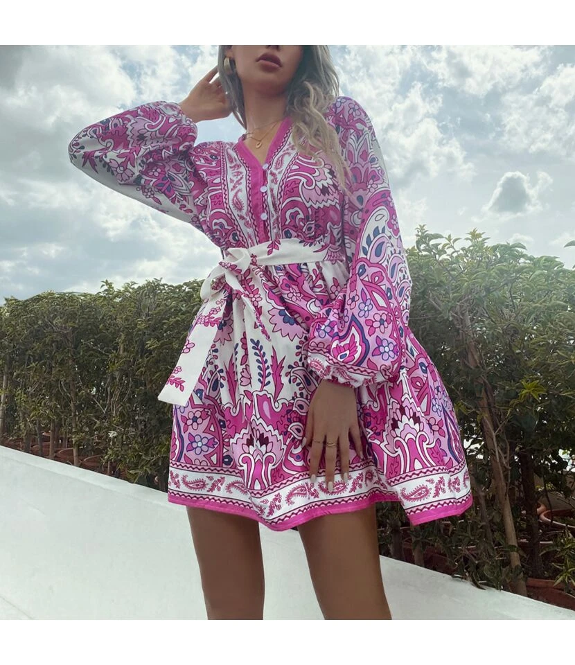 Lantern Sleeve Pleated Print Temperament Elegant Long-Sleeved Dress Wholesale Dresses N4623062500011