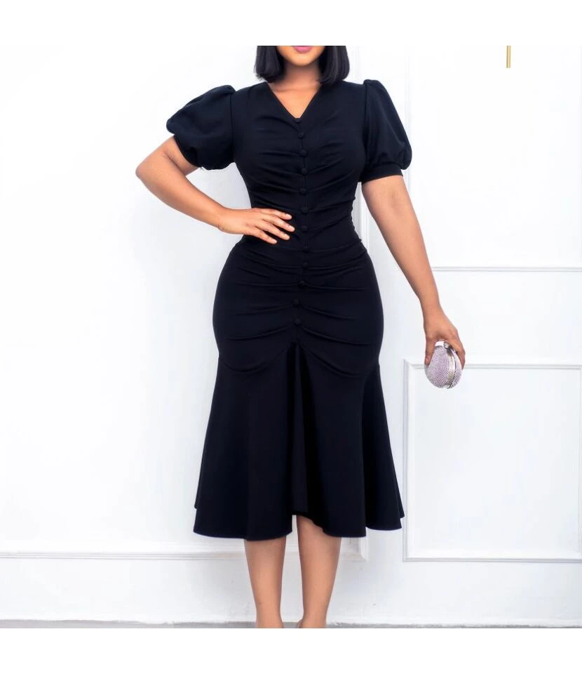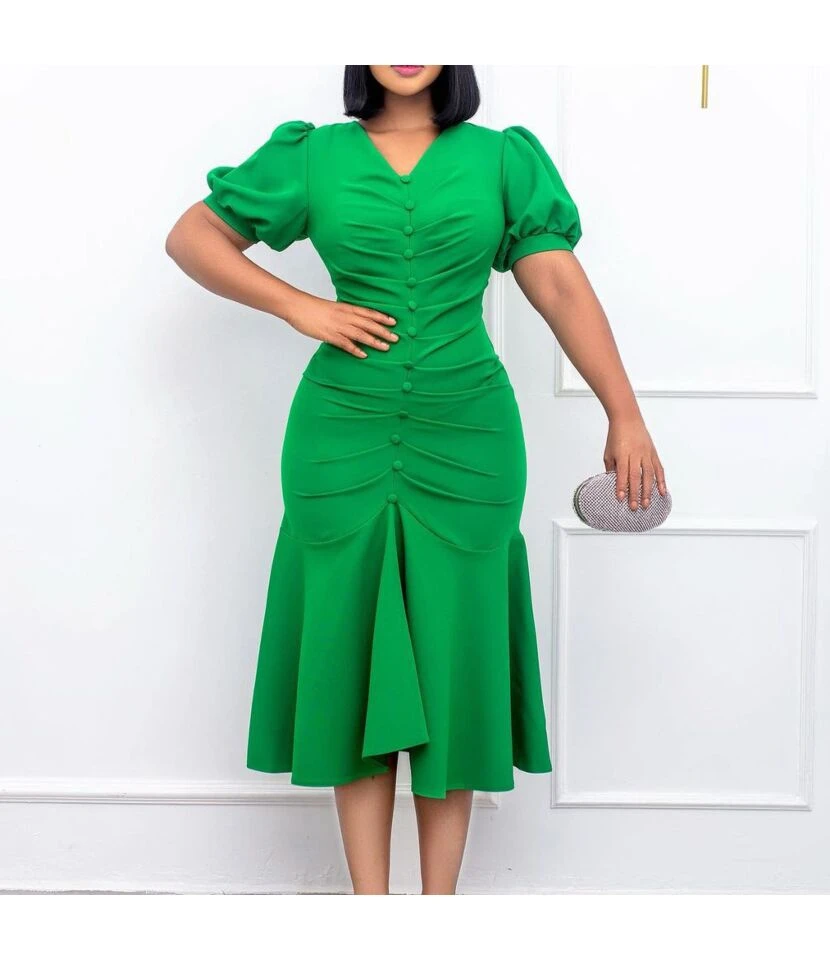 Solid Color V-Neck Waist Short-Sleeve Casual Ruffled Dress Wholesale Dresses SDN537952