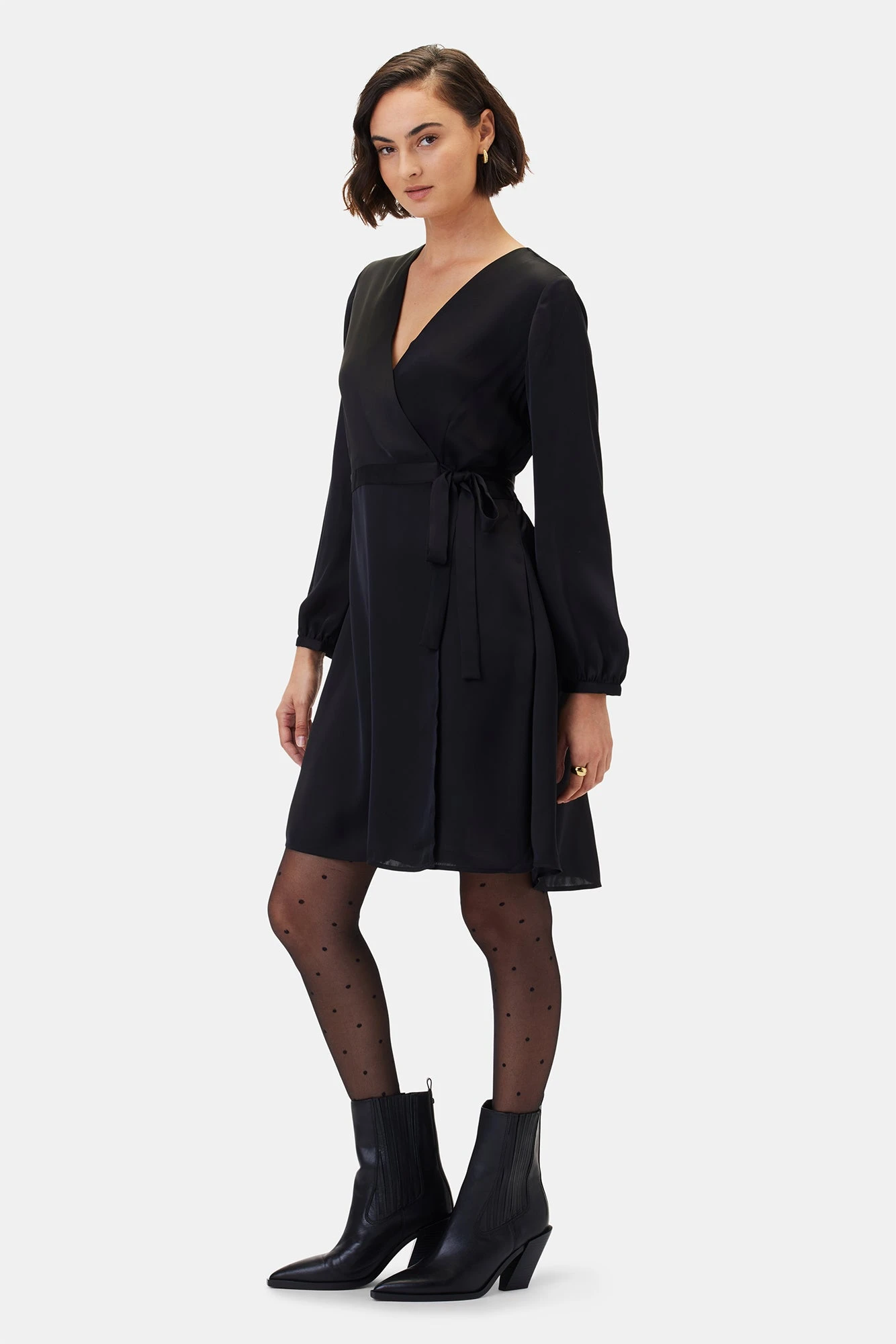 - Long sleeve a-line wrap dress with a fixed waist, elastic back waist detail, and tie.