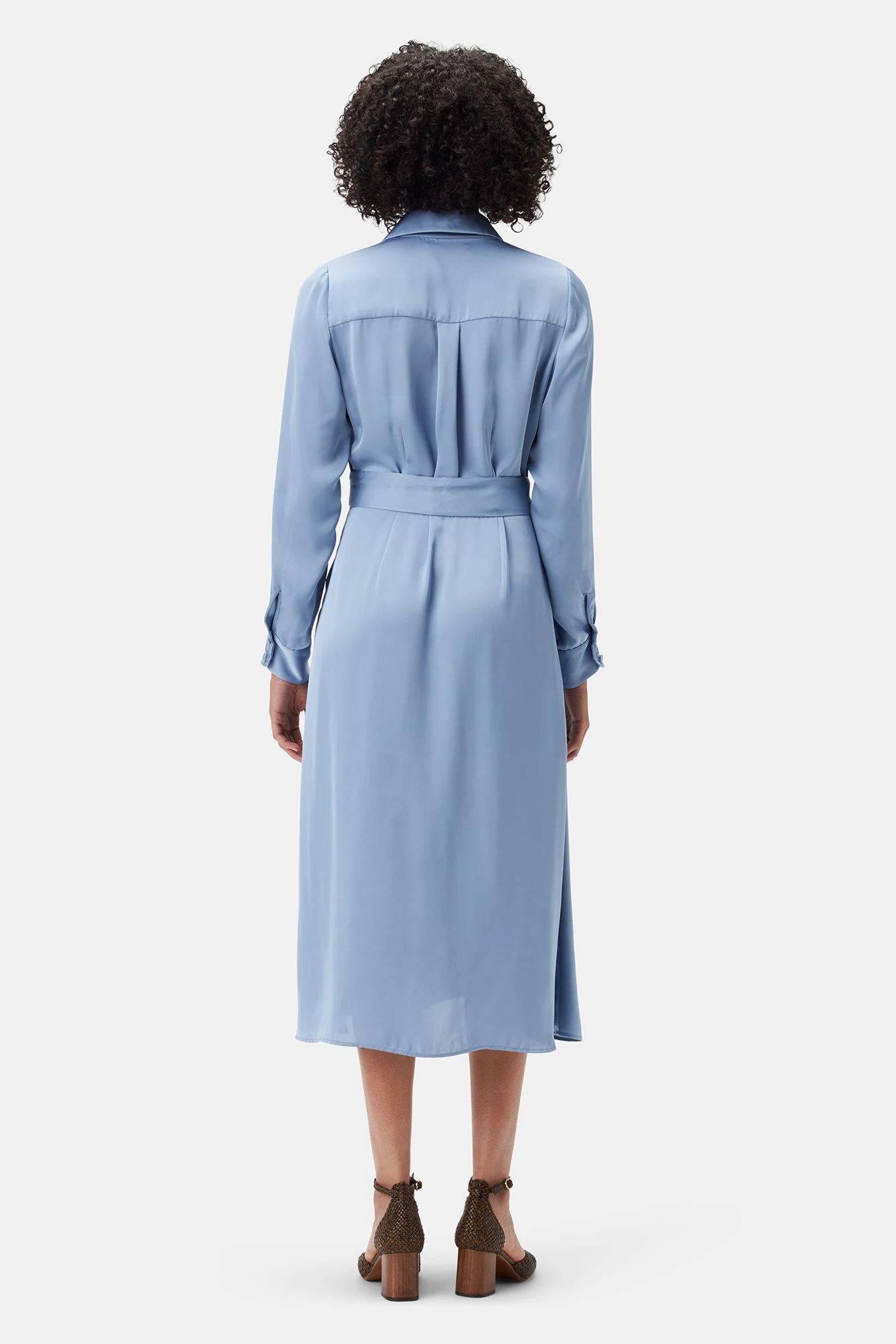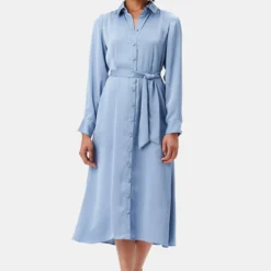 - Long sleeve shirtdress featuring an a-line silhouette, functional buttons and detachable tie at waist.
