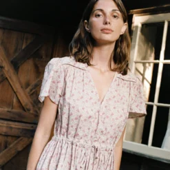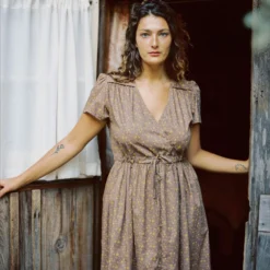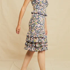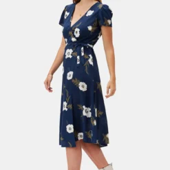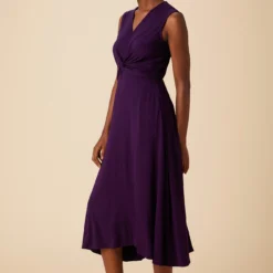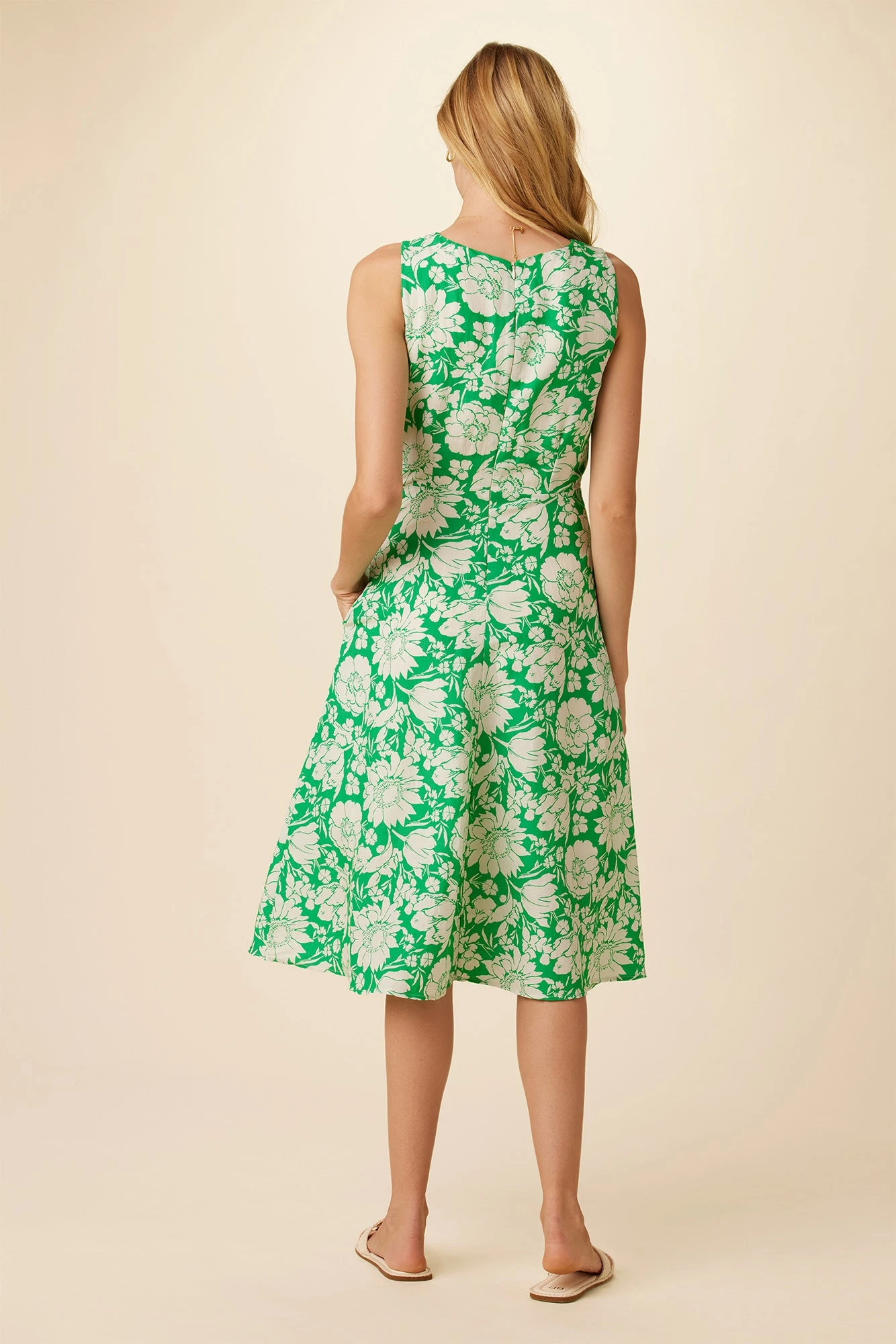 V-neck, sleeveless midi dress featuring an a-line skirt, side pockets, tie waist and invisible back zipper.