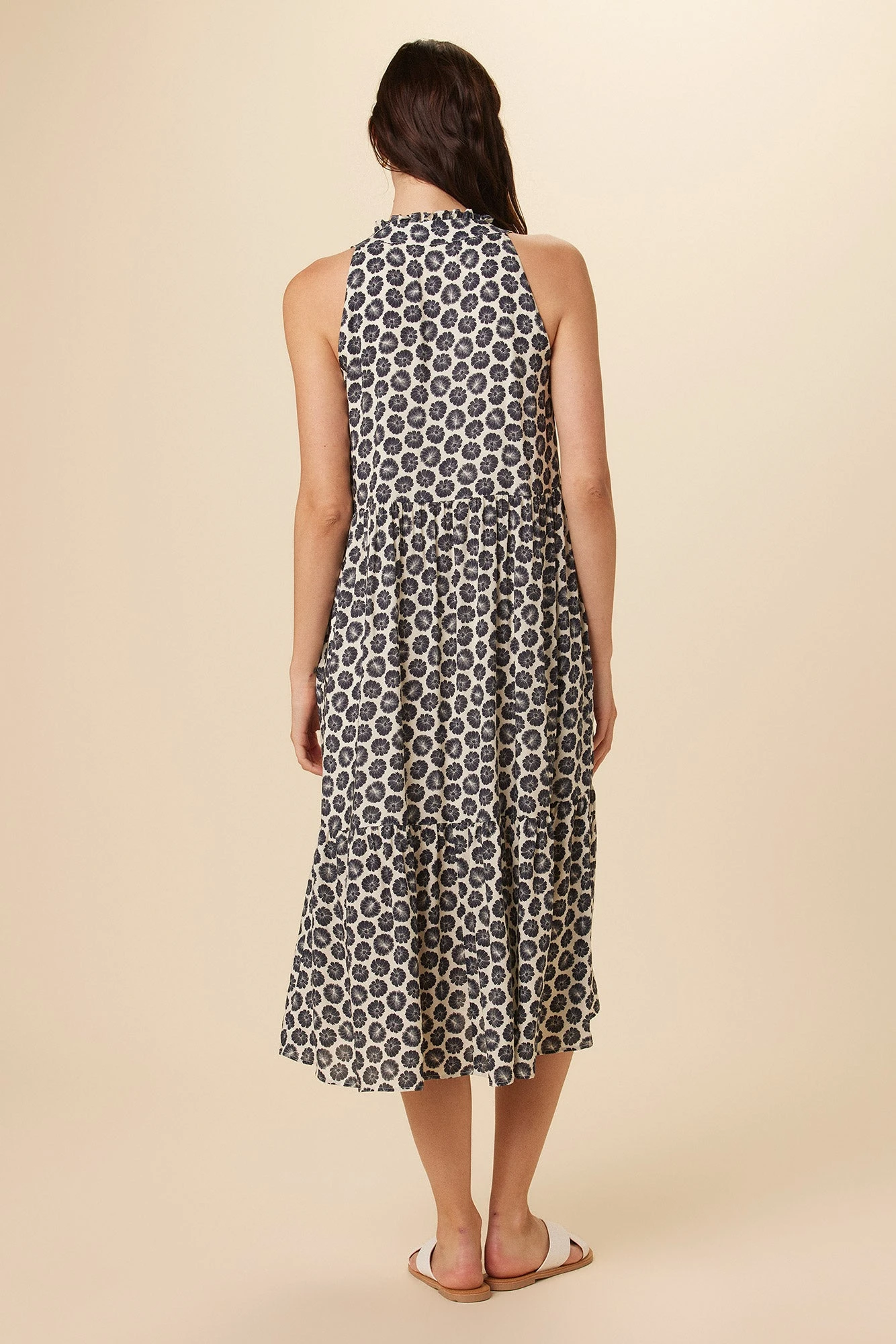 Relaxed fit midi dress featuring an empire seam, attached lining and halter detail with two button closure. Made sustainably in our Ecovero Viscose fabric.