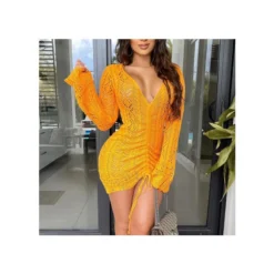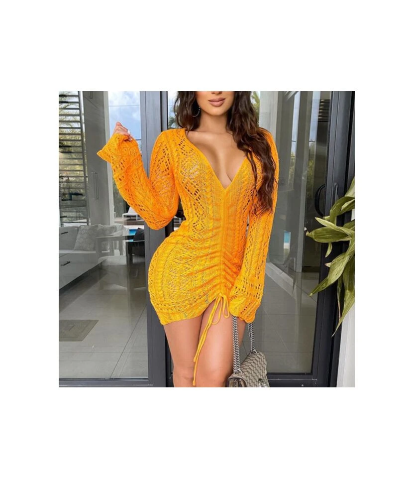 Casual V-Neck Lapel Mini Dress Single-Breasted Long Sleeve Bodycon Wholesale Dresses SDN562274