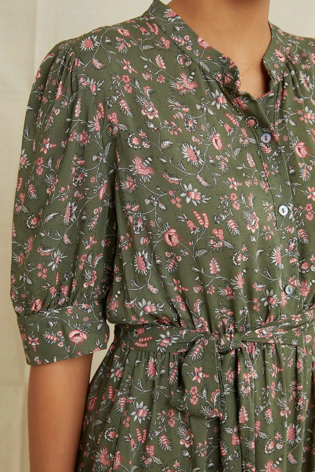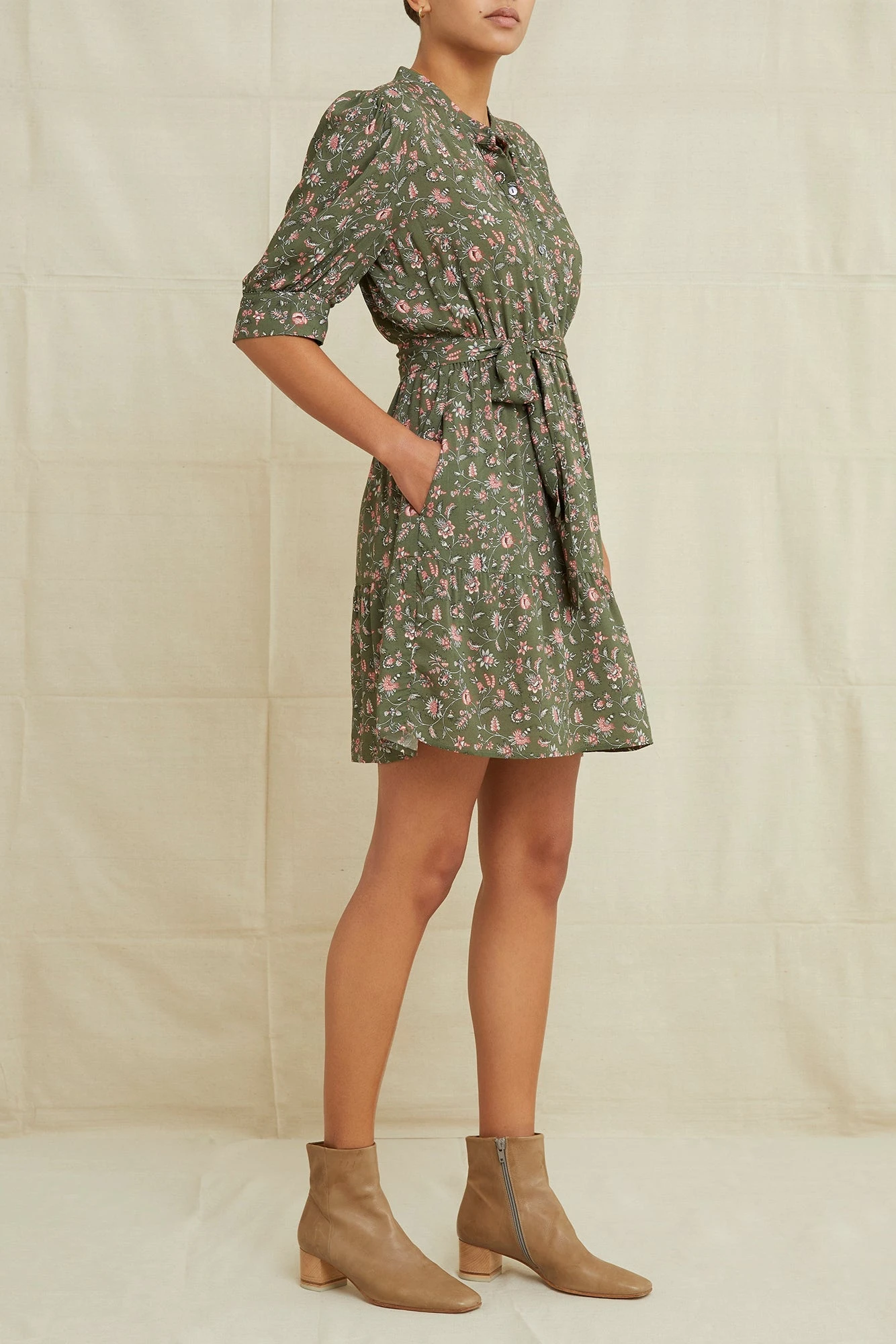 Made from upcycled and repurposed fabrics, this chic dress features short sleeves, inseam pockets, removable tie and is unlined.