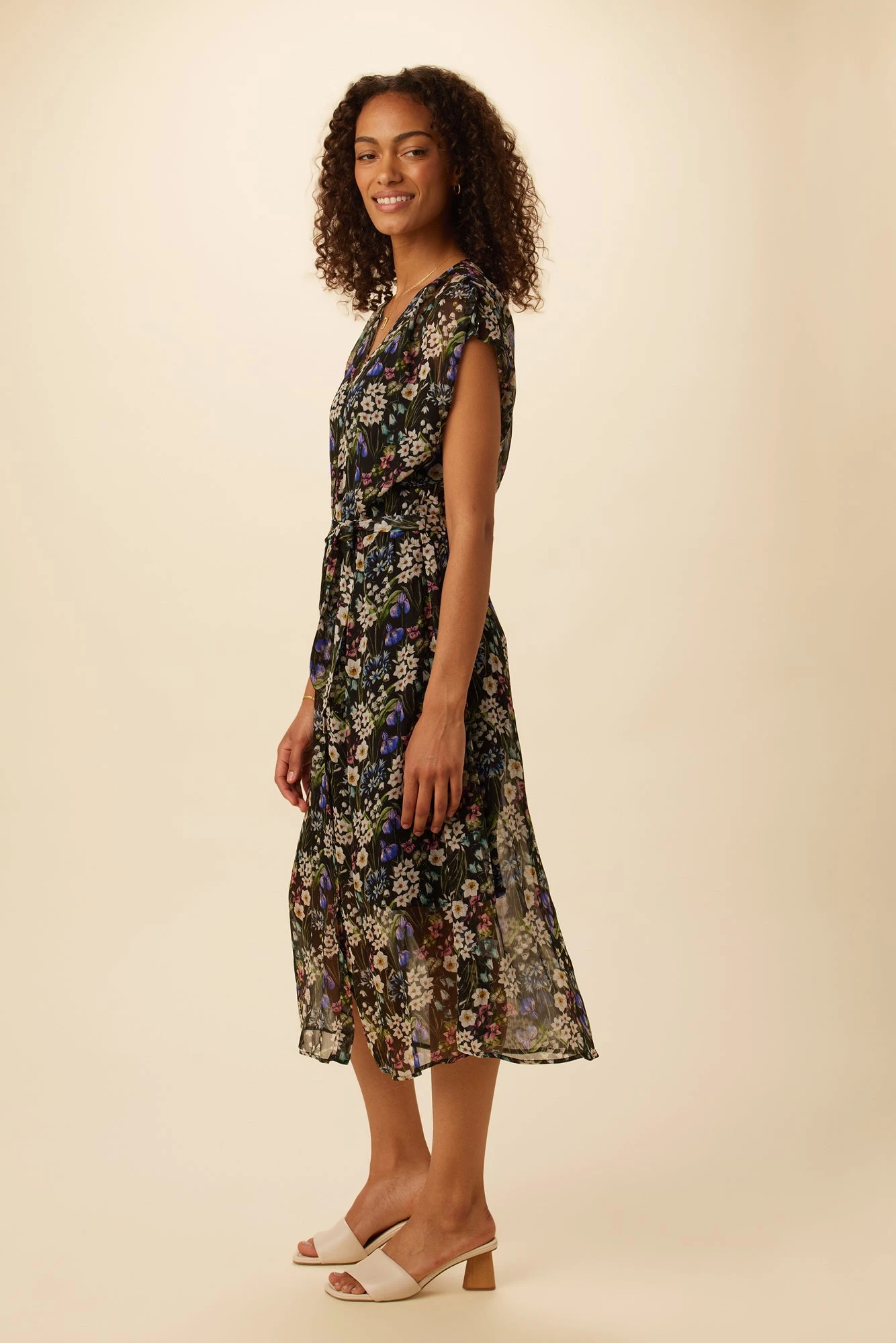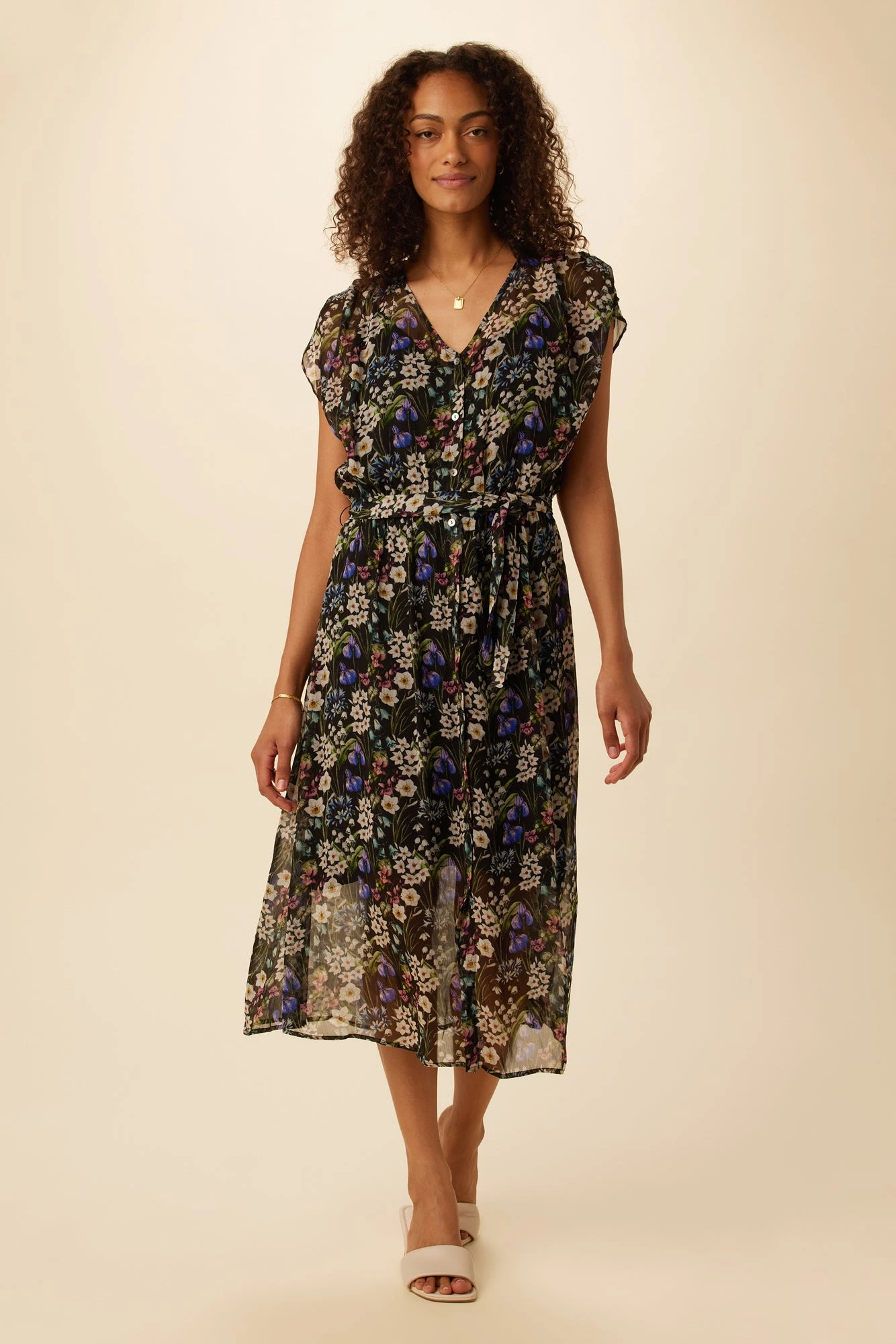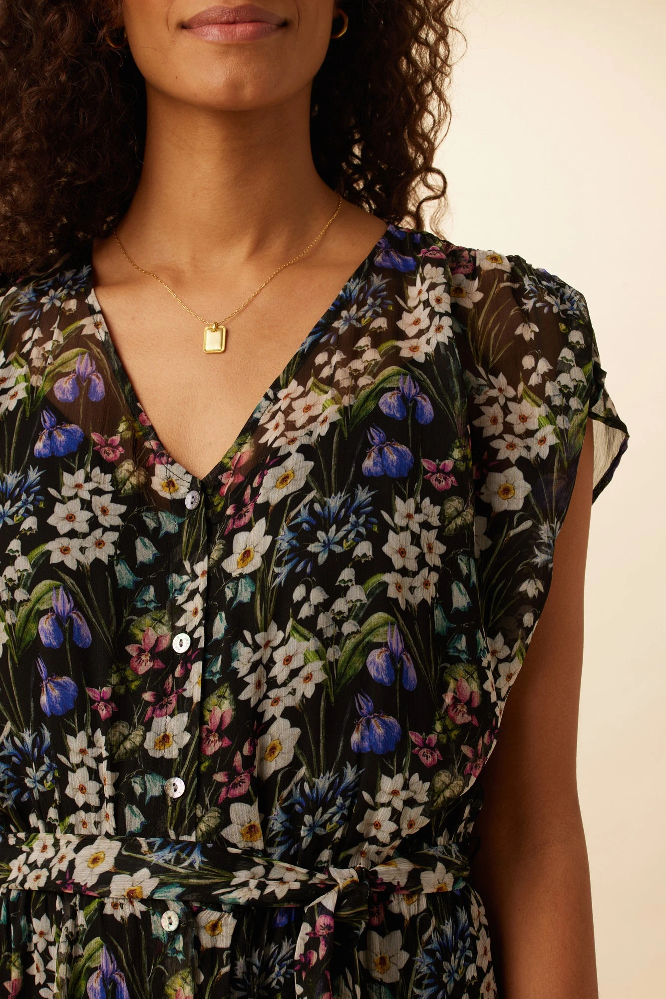Button front, short sleeve dress featuring a v-neckline, tie waist detail and slip lining. This breezy dress is made from our Viscose Chiffon fabric, with an upcycled polyester lining.