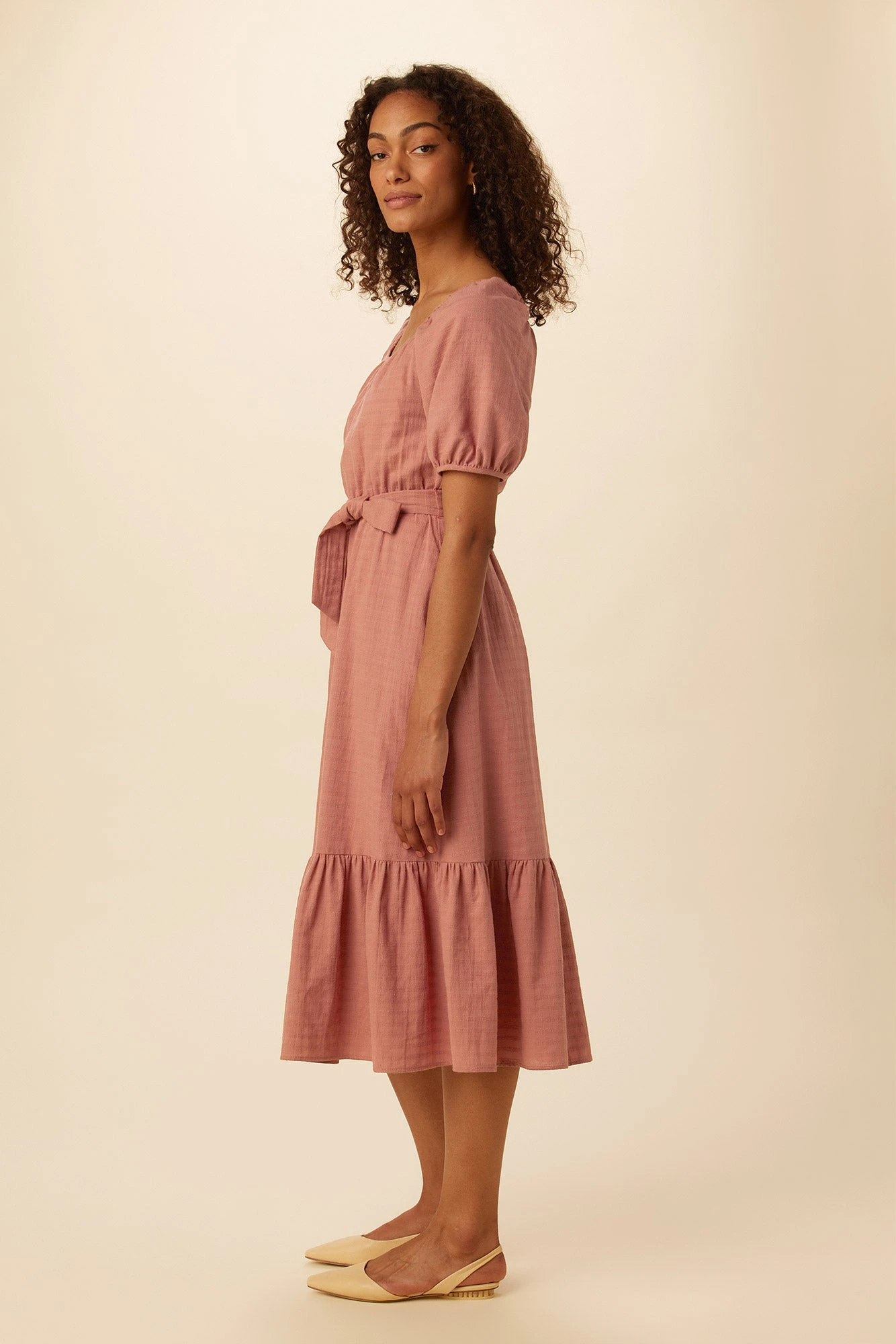 Short sleeve midi dress with a square neckline, ruffle hem and tie waist detail, made from 100% Organic Cotton.
