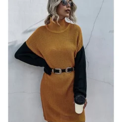 This Mock Neck Colorblock Stitching Without Belt is what fashionable women have wanted to wear for a long time. They may be the first thought that springs to mind when planning a date night look, as Mock Neck Colorblock Stitching Without Belt can still make you appear flirtatious and appealing. It’s a fact. The sweater with the color block stitching is out in great strength. Because you love a fantastic mock neck, it could be your go-to sweater style. Itβs always a good pick, whether you go peaceful with the colorblock or not. Whether you choose a humorous print, a saying, or something else, having Mock Neck Colorblock Stitching Sweater Dress Without Belt on hand is always a good idea. It may instantly elevate the quality of your ensemble. Mock Neck Colorblock Stitching Sweater Dress Without Belt relieves pressure in the torso. Mock necks are also excellent for layering your long neck.