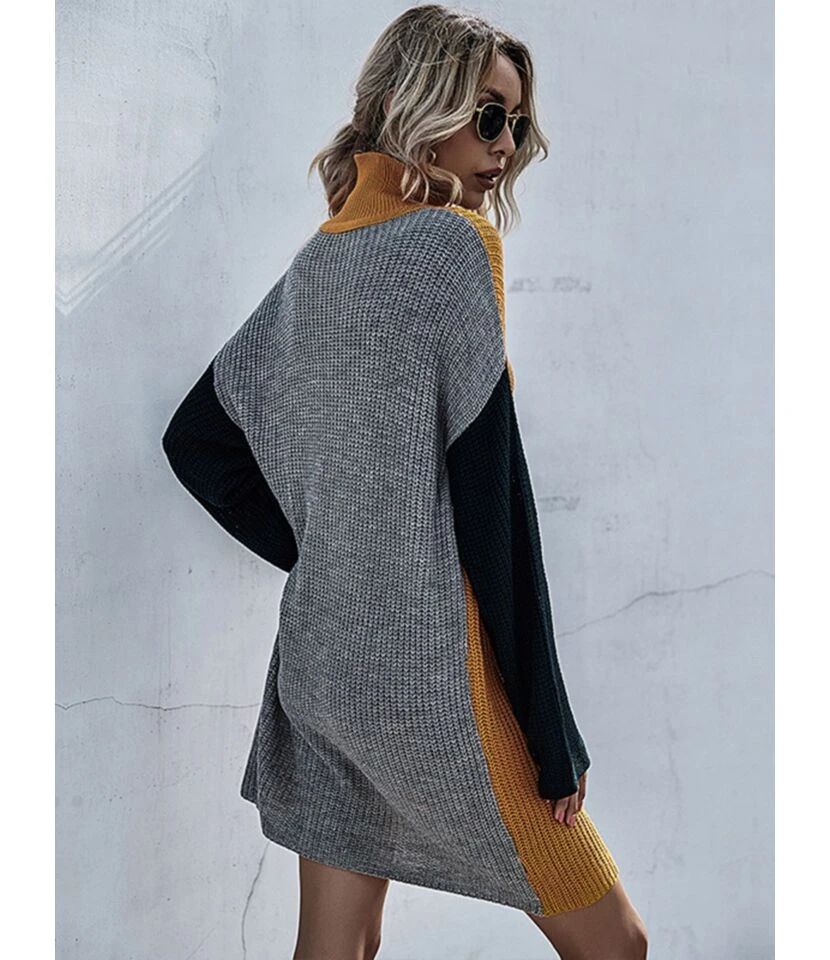 MOCK NECK COLORBLOCK STITCHING SWEATER DRESS WITHOUT BELT
