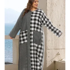 Are you looking for the most comfortable and sober maxi dress for the winter and autumn season? If yes then go through this Plus Size Plaid Stitching Stripes Pocket Long Sleeve Maxi Dress. This dress is very easy to put on and down, its plaid stitching and stripes pockets make it more comfortable, you can keep your mobile, and important small accessorize into the pocket there will be no need to carry the purse everywhere. This dress is also comfortable for pregnant women; there are lots of women who want to hide their fat tummy and body parts so this dress can be a gift for such pregnant ladies because it perfectly hides their body features. It is made by using cotton blends, polyester material. Gift this plaid print outfit to your plus-size woman, she will definitely like it. At SheStar we have been offering a huge collection for plus-size women, we are not like other ordinary stores; we keep updating the plus-size variety every single day with new designs.