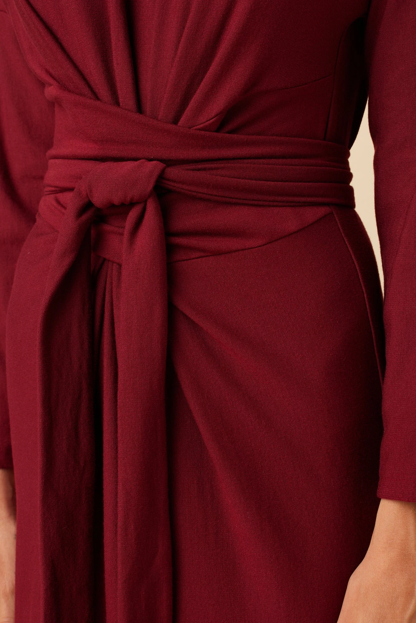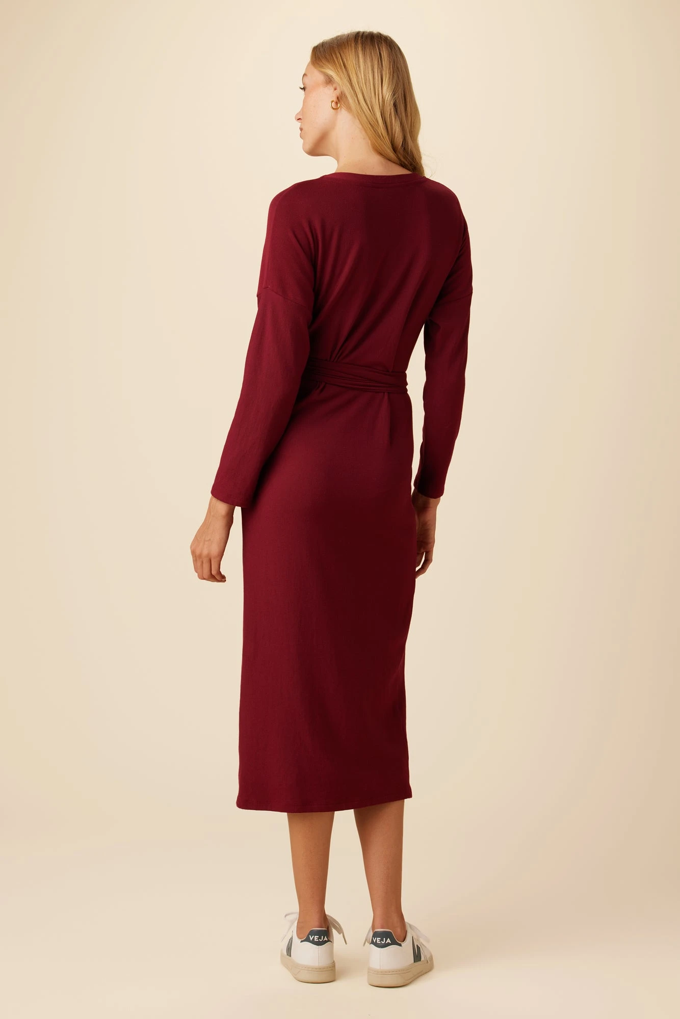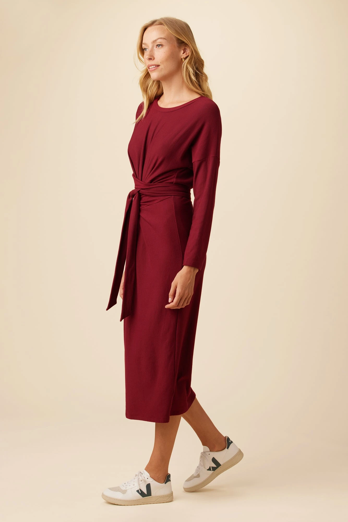 Long sleeve midi dress with an adjustable wrap tie and easy, straight silhouette. Made from our cozy fleece fabrics, this dress is as comfortable as it is flattering.