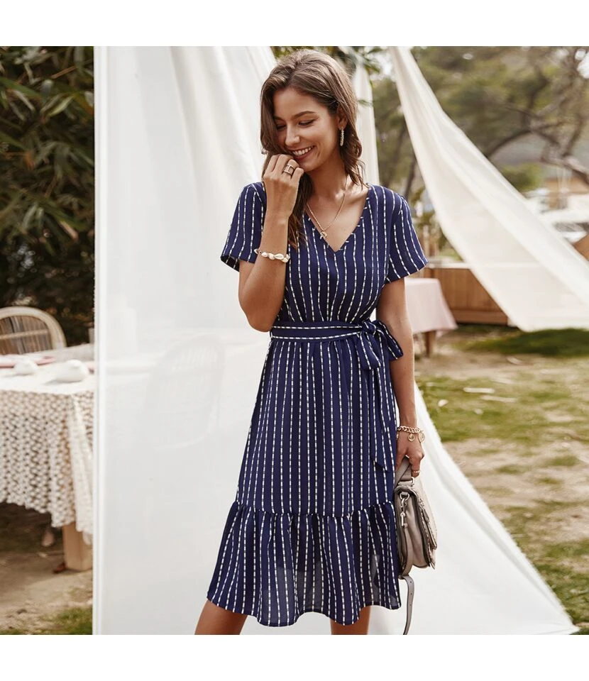 Sexy V-Neck Striped Dress Casual Short Sleeve Lace Up Wholesale Dresses SDN560302