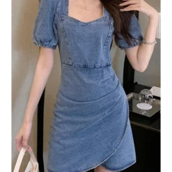 Square Collar lantern Sleeve Elastic Cuff Surplice Bottom Denim Dress