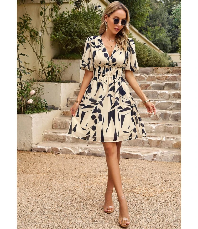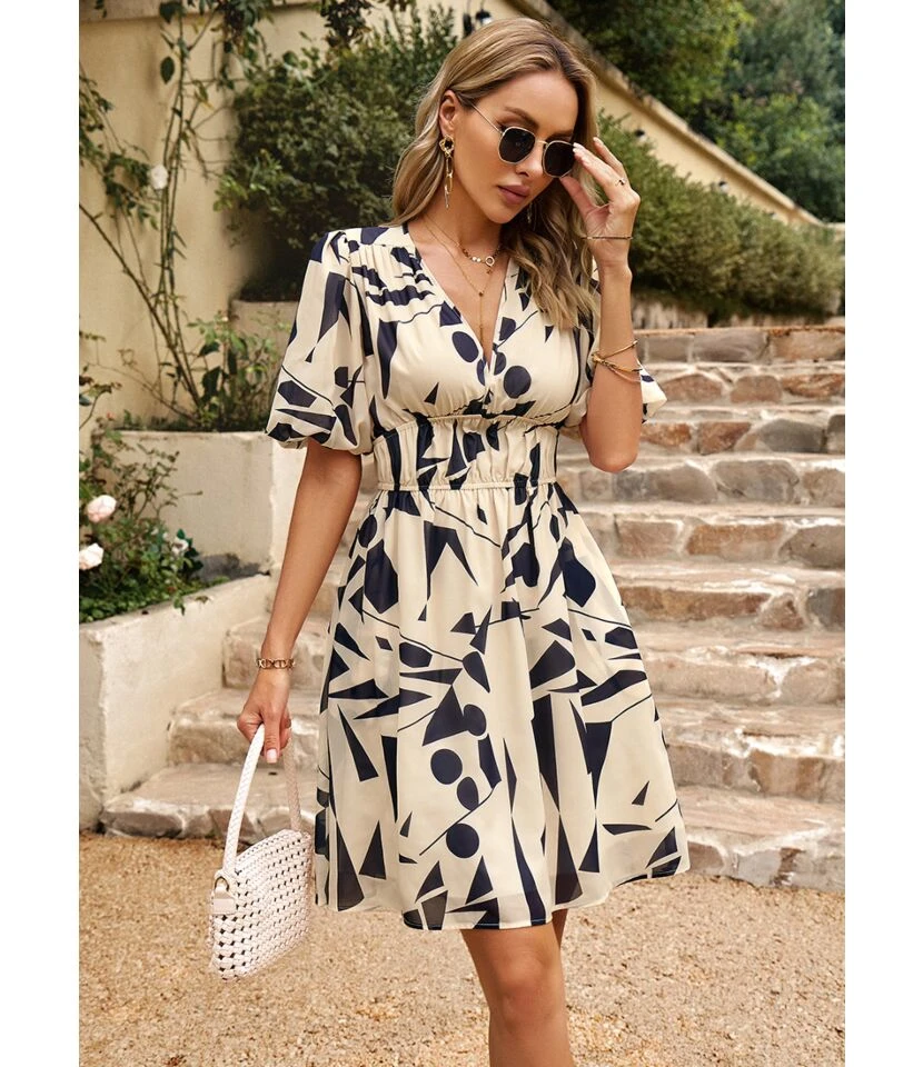 Solid Color V-Neck Waist Short-Sleeve Casual Ruffled Dress Wholesale Dresses SDN537952