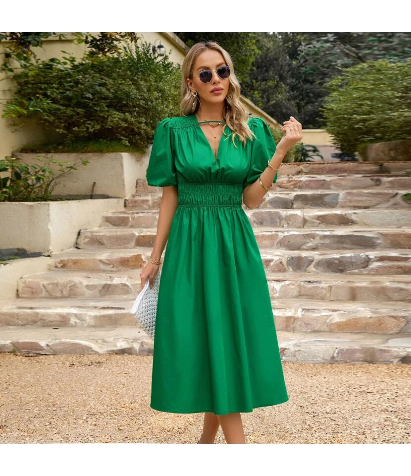 Temperament Round Neck Strapless Short-Sleeved Pleated Waist Dress Wholesale Dresses N5323032800183
