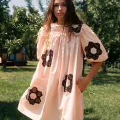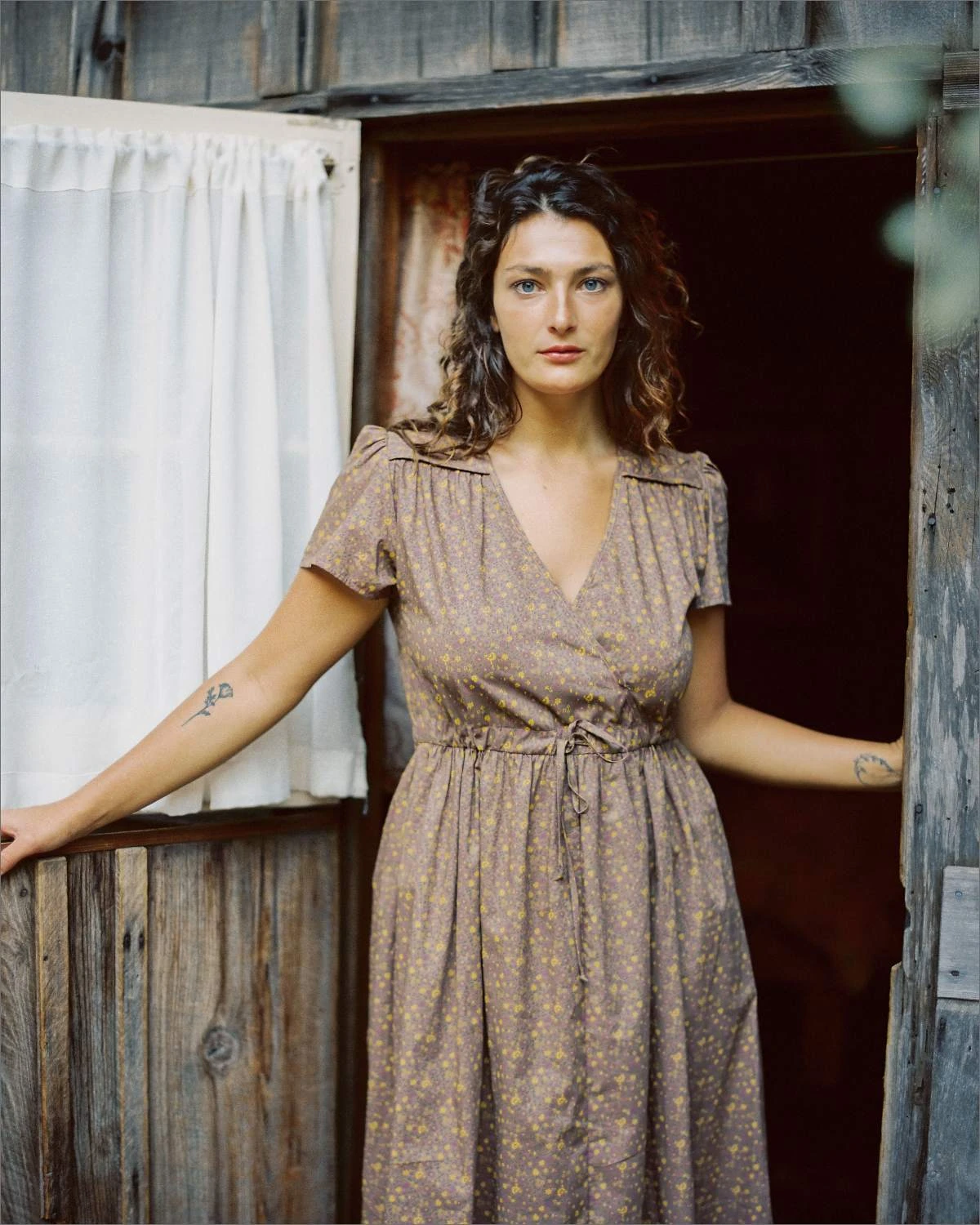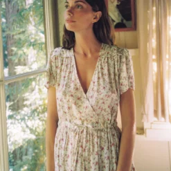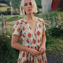 - Brown background with a yellow, pink and green floral pattern rotary printed using organically certified dyes – please note, this fabric varies under different lighting. The colors have a mauve undertone up close and appear brown from afar.