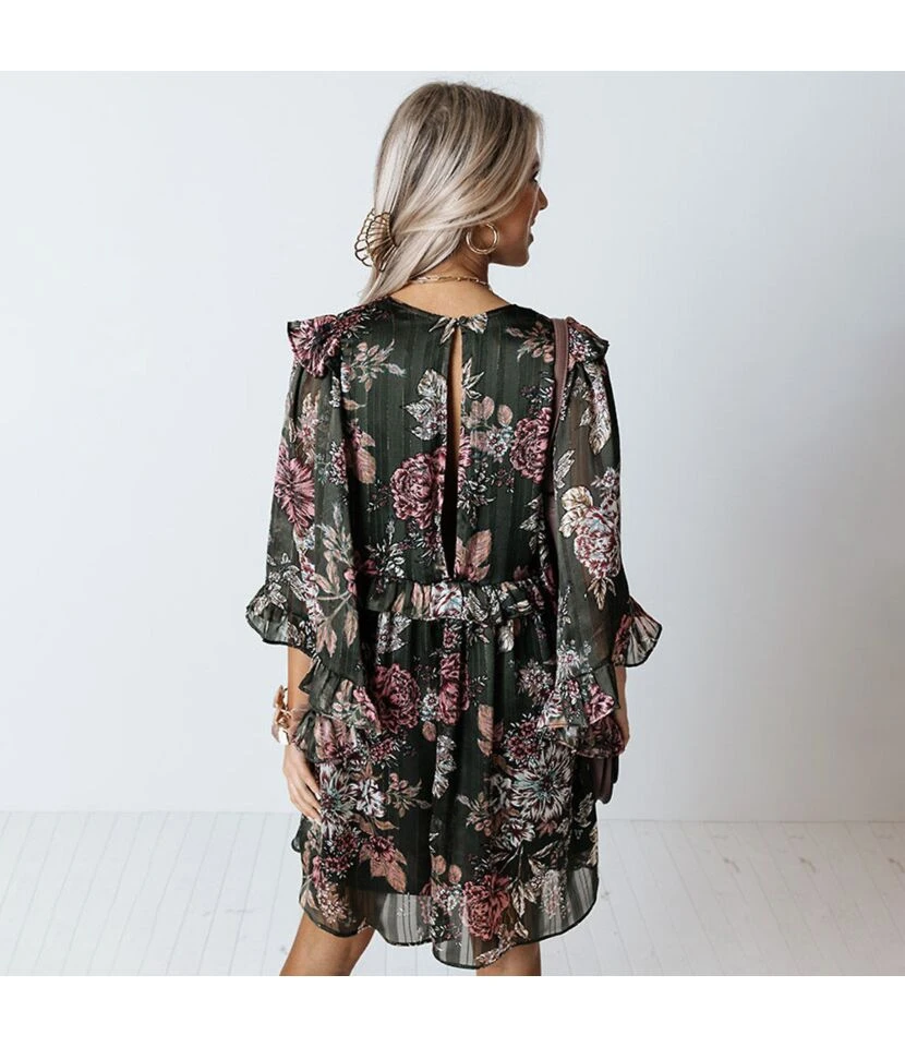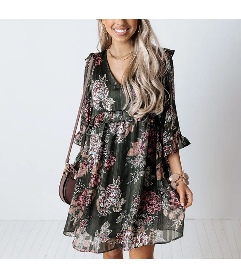V-Neck Fashion Printed Ruffled 3/4 Sleeve Casual Dress Wholesale Dresses Chiffon Dress Chic SD204218