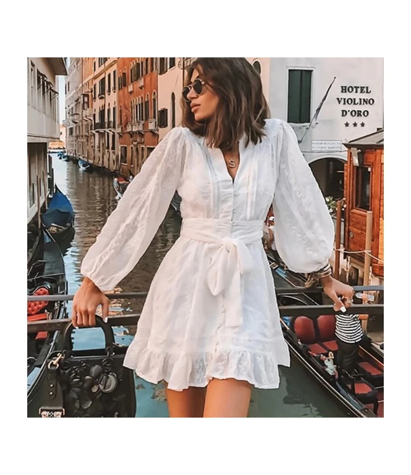 V Neck Solid Color Long Sleeve Ruffles Lace Swing Dress Chic Vacation Wholesale Dresses SD531768