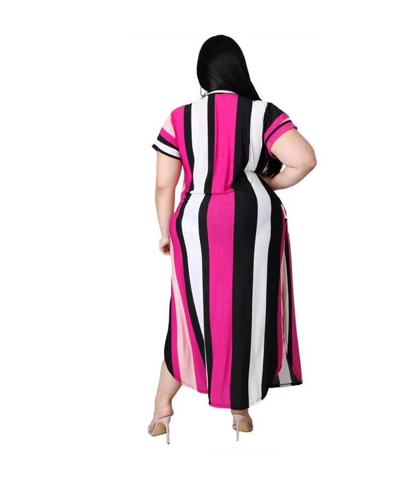 This V-neck striped plus-size maxi dress is so colorful and adorable. No one can opt for a better option than this casual wear. The colorful striped print in a combo of black and pink color adds a mesmerizing effect by making it look bright and pleasant to look at. The round bottom adds a sweet look slightly up from the sides. This sassy V-neck will never let you regret your choice. This outfit is for sure providing you with a slimmer effect as it covers your body perfectly from head to toe. Wear it with a pair of strappy high heels and some light jewelry like a pair of long earrings, and a bracelet, or a gold or silver wristwatch. This summer outfit is made in a loose-fitting so that it will not be clingy and maintains your body temperature by keeping it in equilibrium. Try not to tie your hair tightly instead go for an open hair option. Make some loose curls and let them free.