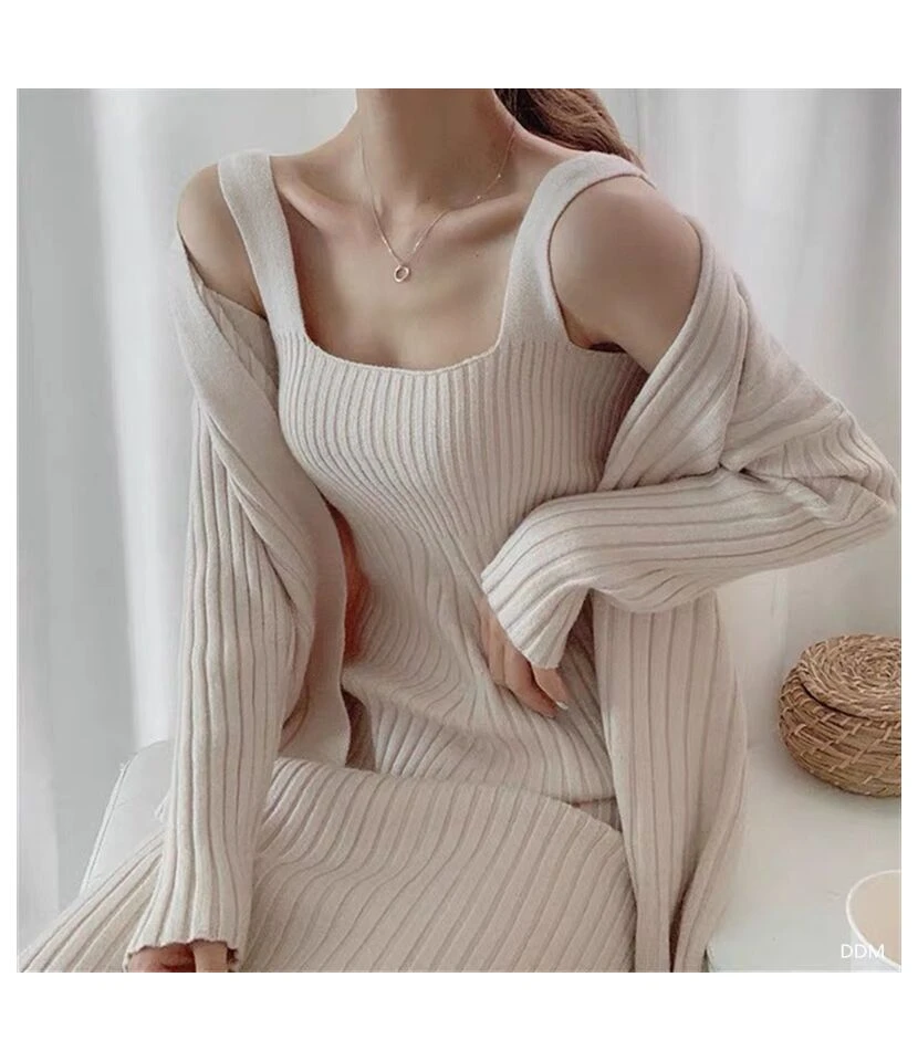 Wholesale Womens 2 Piece Sets Sling Knitted Midi Dress & Long Sleeve Cardigan SON562672